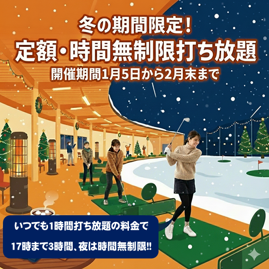 冬の期間限定イベント開催します!! 1月5日~2月末まで1時間打ち放題の料金で 3時間打ち放題です。 17時以降は時間無制限となります!! 是非お越しください!!